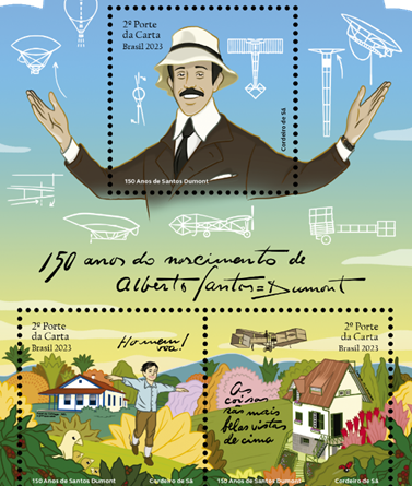 O selo – A emissão postal é formada por três selos e mostra a vida de Santos Dumont que, em representação pouco usual, sorri entre seus projetos. O bloco postal inicia a trajetória do inventor trazendo tanto a casa onde nasceu (Fazenda Cabangu, em Santos Dumont/MG) como também aquela que projetou para si (A Encantada, Petrópolis/RJ). Sua criatividade é representada pelo colorido diverso e por duas de suas frases que, como o texto principal, são escritas simulando sua caligrafia. Ao mesmo tempo em que o menino antevê o voo de braços abertos e com sapatos desamarrados que remetem a Hermes, o adulto no 14-Bis recorda o sonho. A cidade de Dumont, onde cresceu, está no cafezal que abriga seres voadores. Há alusões ao relógio de pulso e aos aplausos que recebeu em vida. A arte de Cordeiro de Sá utilizou a técnica de ilustração digital.