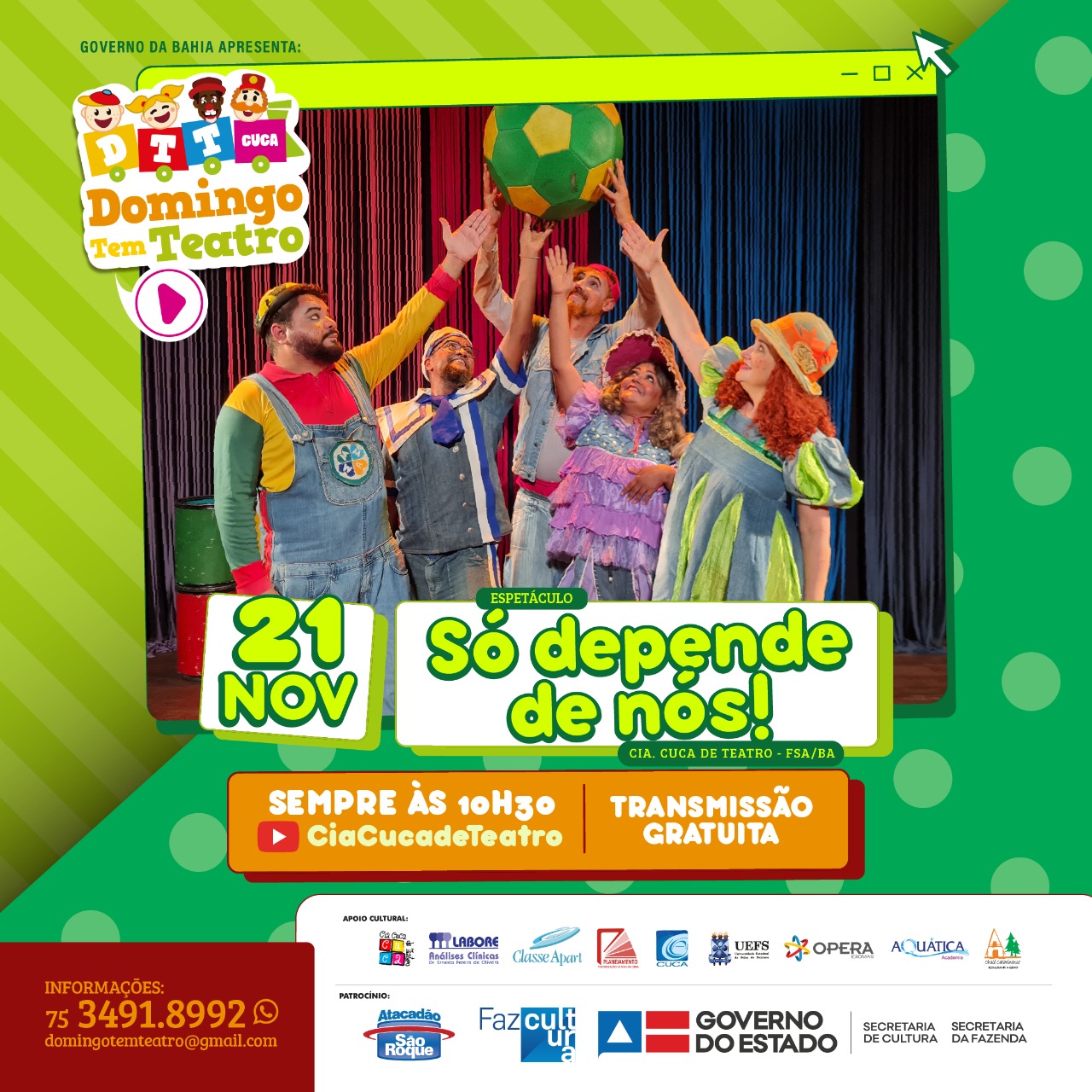 Reforçamos o convite para que todos possam acompanhar o DTT, de forma online, nesse domingo (21/11) às 10h30h, com transmissão ao vivo do espetáculo “Só depende de nós” pelo Canal da Cia. Cuca de Teatro no YouTube, de forma gratuita.