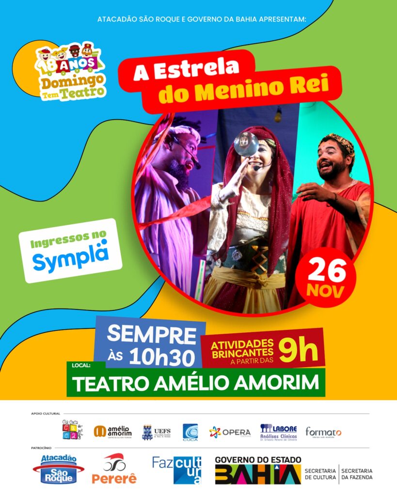 O Domingo Tem Teatro convida o grande público para assistir a mais bela história de todos os tempos contada e cantada pelo espetáculo “A Estrela do Menino Rei”. O auto de Natal realizado pela Cia. Cuca de Teatro e artistas convidados vai animar e iluminar as manhãs de domingo no Teatro Amélio Amorim com apresentações nos dias 26 de novembro e 03 de dezembro de 2023.