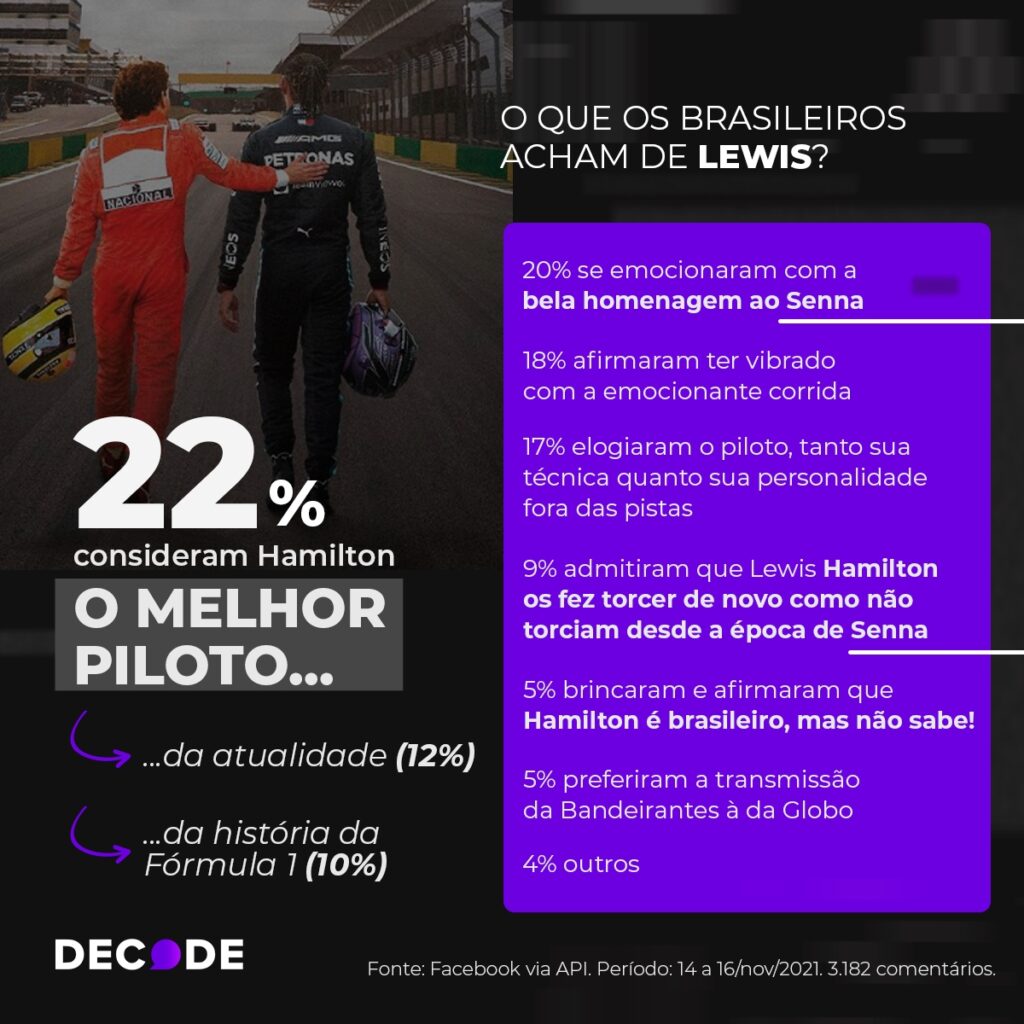 Segundo uma parcela dos usuários do Facebook, sim. 22% dos comentários da rede social analisados pela Decode, empresa de client acquisition e consulting do grupo BTG Pactual, mencionavam Hamilton como o melhor piloto, se dividindo entre “da atualidade” (12%) e “da história da Fórmula 1” (10%).