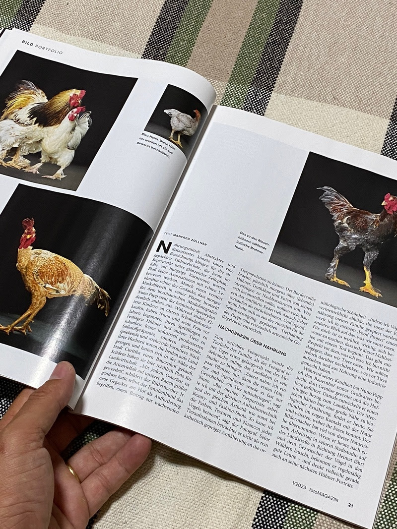 A matéria de capa, com seis páginas, traz um perfil do artista e é ilustrada com seu último projeto, o “The Food Project”, em que galinhas, patos e galos são protagonistas de um ensaio de moda e se tornam modelos. O projeto traz um diferente olhar para a comida, humanizando as aves que são criadas pelo fotógrafo para alimentação de sua família, na chácara onde mora no Brasil.