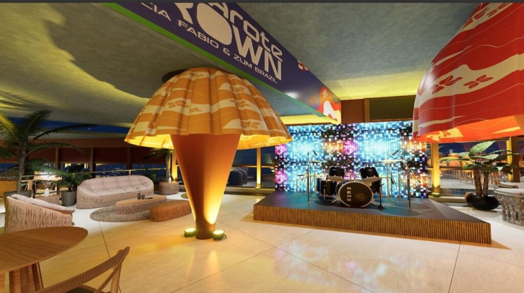 No projeto idealizado e conceituado pela Zum Brazil, o camarote foi concebido como uma imersão no universo do samba de roda, com cenografia que mescla tradição e contemporaneidade. Ao utilizar elementos e texturas da cultura baiana e do Recôncavo, a NN Arquitetura criou uma decoração instagramável com elementos e objetos em palha, madeira e fibras naturais. O resultado é uma ambientação sofisticada e acolhedora, com móveis exclusivos da marca baiana Tidelli, destacando cadeiras e poltronas de muito conforto nas áreas externas e internas.