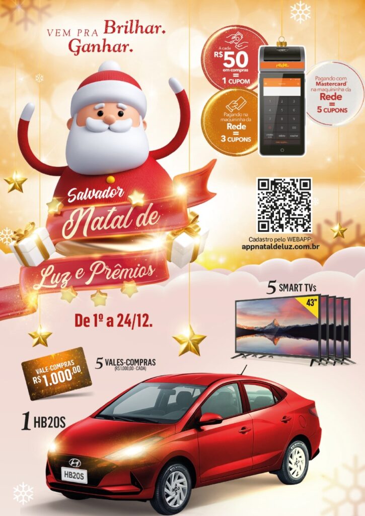 A participação no “Salvador, Natal de Luz e Prêmios” é feita no site ou aplicativo oficial da campanha appnataldeluz.com.br, acessível por celular, computador ou tablet. O cadastro é simples e rápido, e exige o fornecimento de informações como nome, endereço, CPF e identidade. Também é necessário responder à pergunta: “Qual é a maior promoção de fim de ano de Salvador?” A resposta correta é “Salvador Natal de Luz e Prêmios”.