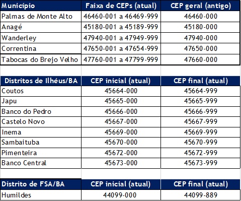 Os Correios concluíram, nos últimos meses, os projetos de codificação postal dos municípios de Palmas de Monte Alto, Anagé, Wanderley, Correntina e Tabocas do Brejo Velho, além de sete distritos pertencentes à Ilhéus/BA e Humildes (distrito de Feira de Santana/BA). Agora, as localidades possuem todos os logradouros/trechos cadastrados com novo Código de Endereçamento Postal (CEP). Além de facilitar a localização de endereços, beneficiando moradores e empresas que prestam serviços, o sistema ainda permite que o CEP seja usado como referência de garantia de confirmação de endereço, prática comum entre empresas de diversos segmentos.