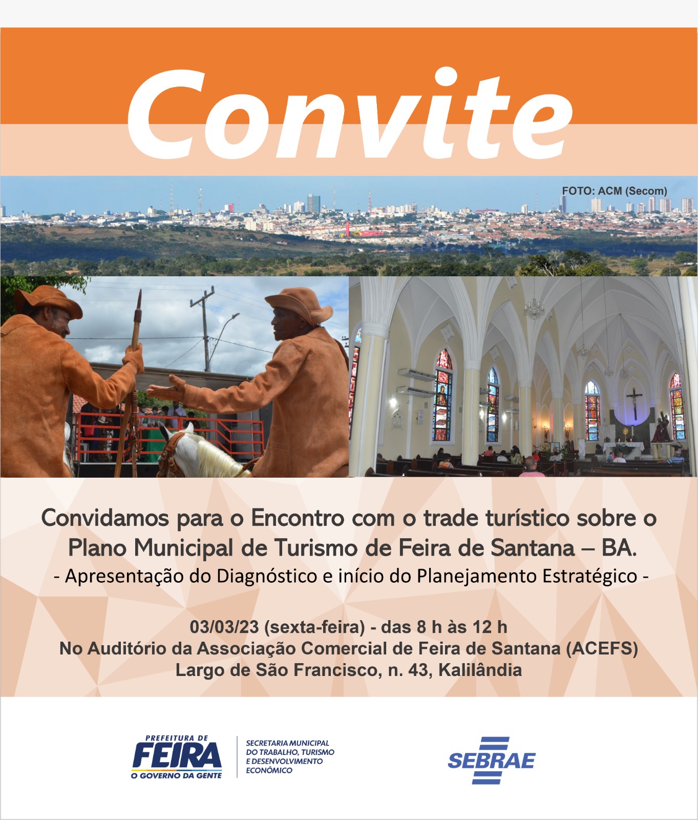 A Prefeitura de Feira convida todos os envolvidos direta e indiretamente com o turismo no município para participar do III Encontro do Plano Municipal de Turismo de Feira de Santana, nesta sexta (3). O objetivo é apresentar os avanços do diagnóstico da oferta e demanda do turismo da cidade, como também elaborar o plano para o futuro.