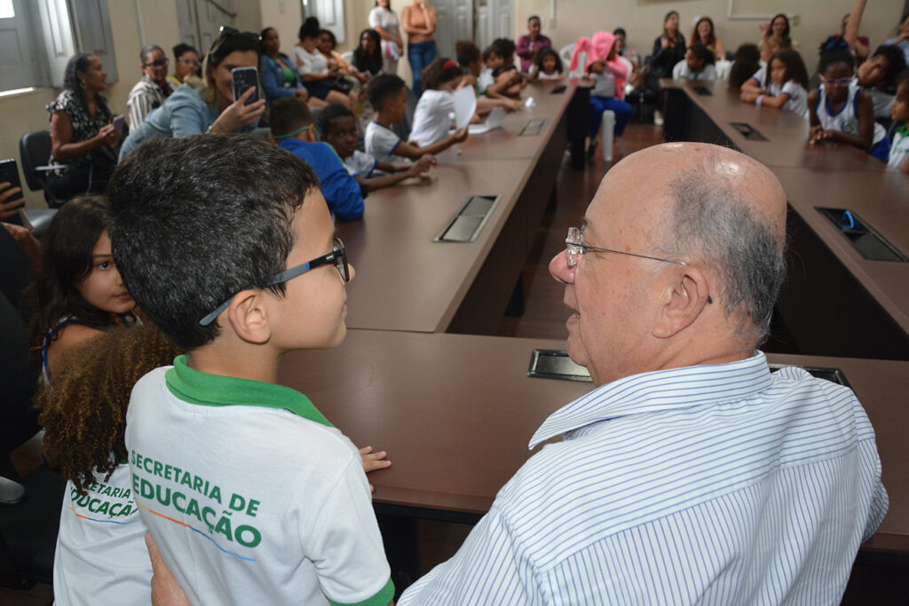 A professora Érika Medeiros, que acompanhou a turma, explicou o objetivo da visita. “No segundo ano, os alunos estudam Feira de Santana: a história, a cultura, os artistas e as construções históricas. Então, hoje tiramos o dia para conhecer, na prática, tudo isso. Já passamos pela Quixabeira da Matinha, visitamos igrejas, almoçamos juntos, fomos ao Casarão Fróes da Motta e viemos à Prefeitura. Essa vivência fortalece a aprendizagem, porque eles viram fotos e agora podem comparar com a realidade”.