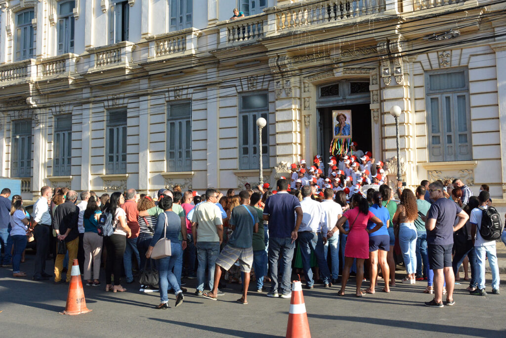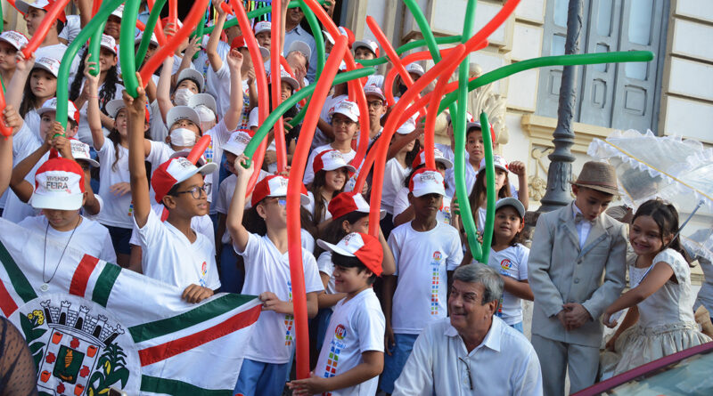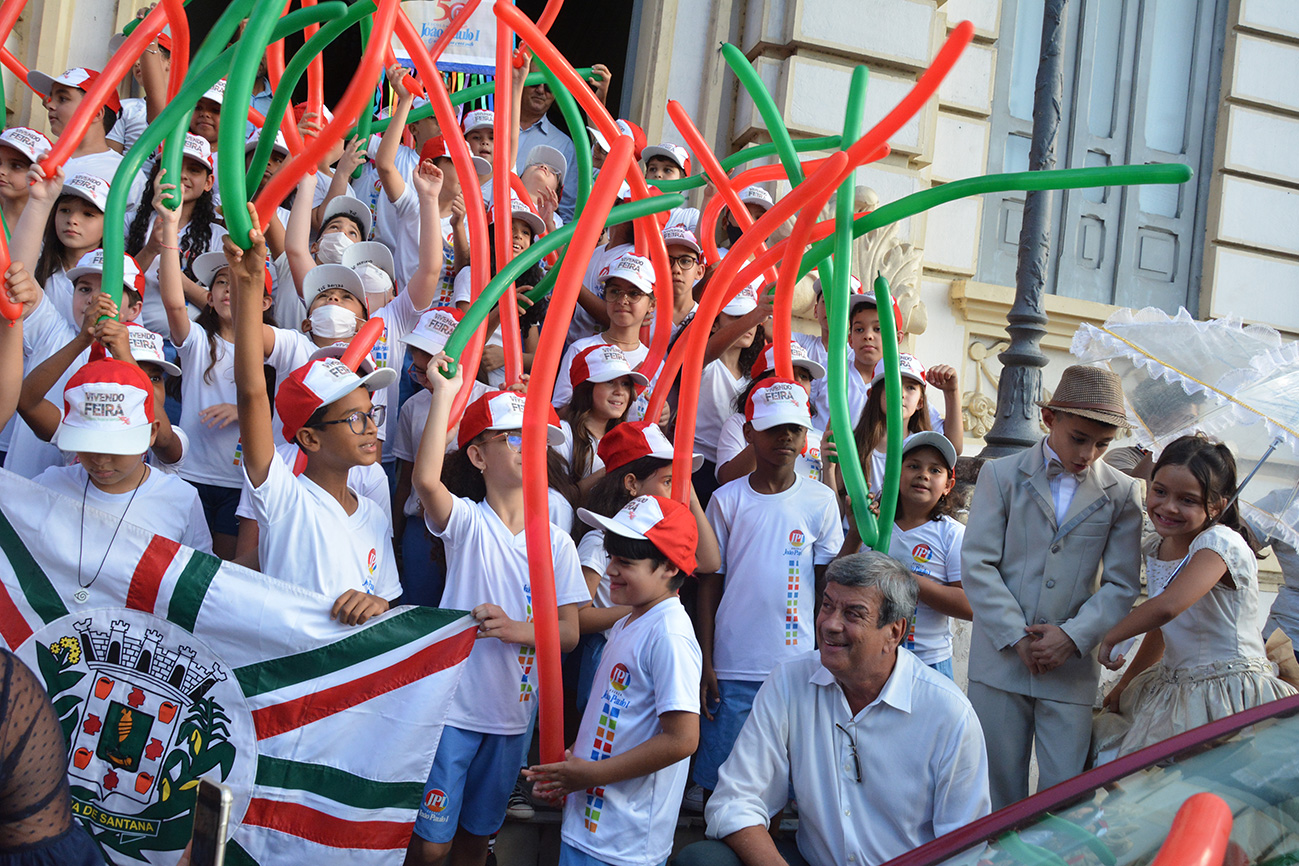 Nas escadarias do Paço Municipal, onde funciona a Prefeitura de Feira, alunos da Escola João Paulo I promoveram uma cantata em comemoração ao aniversário de 189 anos de emancipação política de Feira de Santana nesta quinta-feira (15). O prefeito Colbert Martins Filho acompanhou a apresentação.