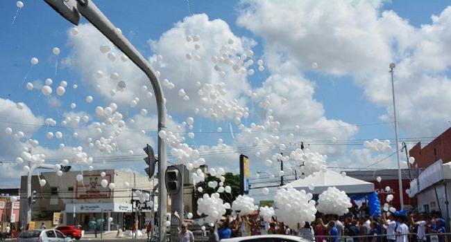 O céu do centro da cidade foi tomado por centenas de balões brancos, na manhã desta sexta-feira, 21, em mais uma ação promovida pela campanha “Feira Pede Paz”, desenvolvida pela Secretaria de Prevenção à Violência (Seprev), e que envolve as demais pastas do Governo Municipal, preocupado com a escalada da criminalidade em Feira de Santana.