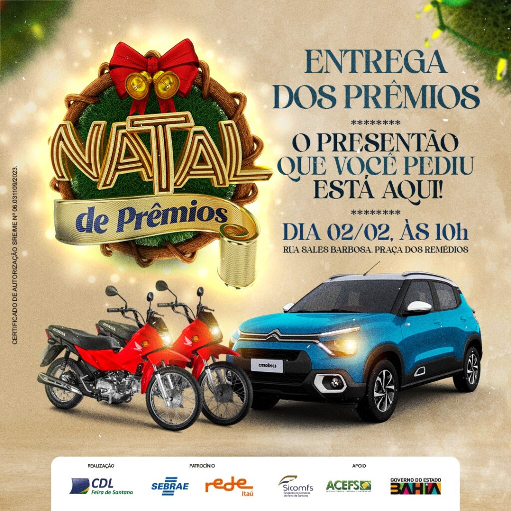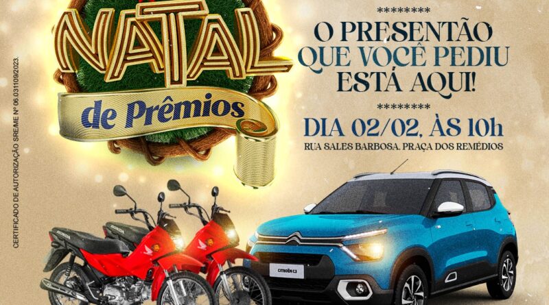 Foram mais de um milhão de cupons distribuídos e três sortudas premiadas. Jaqueline Lopes, Ana Paula Santos e Katharynne da Silva são as grandes vencedoras da campanha Natal de Prêmios 2023. Elas levam para casa, respectivamente, um carro Citroën C3 0km e uma moto Honda Pop, cada. Os veículos, que foram sorteados dia 16 de janeiro, serão entregues nesta sexta-feira (2), às 10h, em evento na Praça dos Remédios, na Rua Sales Barbosa.