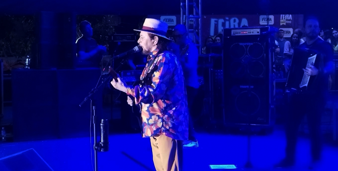O cantor Geraldo Azevedo encantou o público que lotou o espaço de shows no distrito de Humildes na noite deste sábado (1º), no encerramento das festividades de São Pedro, dentro da programação do Feira Cidade Forró. Com uma trajetória sólida na música popular brasileira, Geraldo trouxe em seu repertório uma seleção de sucessos autorais e de outros compositores nordestinos, encantando a todos.