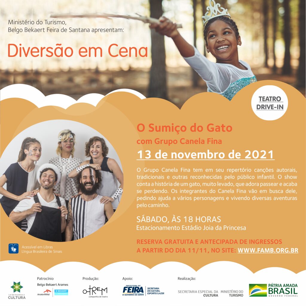 Atração realizada por grupo baiano é promessa de entretenimento para toda a família no Diversão em Cena. A montagem “O Sumiço do Gato” terá sua exibição em formato drive-in, no dia 13/11 (sábado), às 18 horas, no Estacionamento do Estádio Joia da Princesa.
