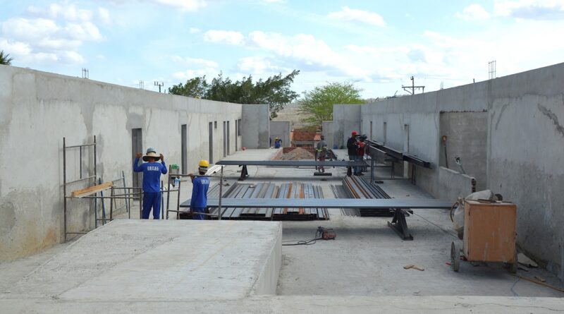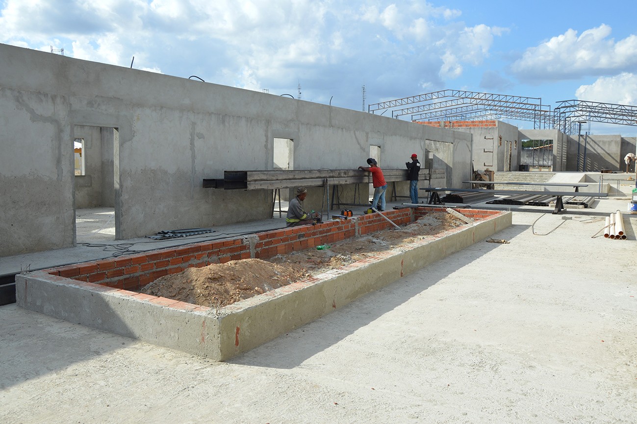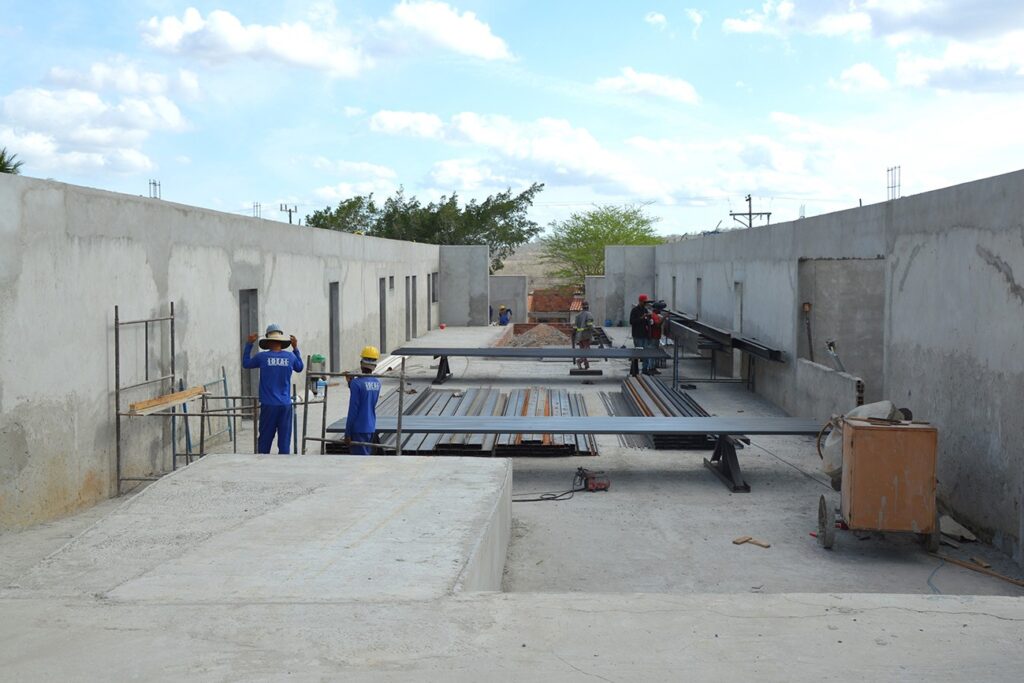 Serviços como chapisco, reboco, fossa e sumidouros já foram concluídos. Agora estão concentrados na instalação da cobertura da quadra com telha termoacústica, revestimento cerâmico nas paredes, fundição do piso de alta resistência e instalações nas redes elétrica e hidráulica.
