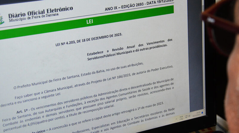 Em publicação realizada nesta terça-feira (19), no Diário Oficial Eletrônico do Município, o prefeito Colbert Filho sancionou o Projeto de Lei 166/2023, de autoria do Poder Executivo, que estabelece a Revisão Anual dos Vencimentos dos Servidores Públicos Municipais em Feira de Santana.