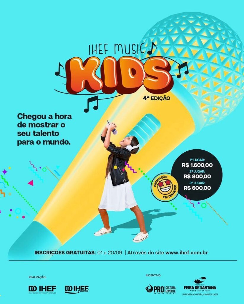 A quarta edição do Concurso IHEF Music Kids está com inscrições abertas até 20 de setembro. O Festival de Música Infantil é gratuito e aberto ao público infanto-juvenil de 9 a 15 anos, para Feira de Santana e região. A premiação vai ser de R$ 1.600 para o 1º lugar, R$ 800,00 para o 2º lugar e R$ 600 para o 3º lugar.