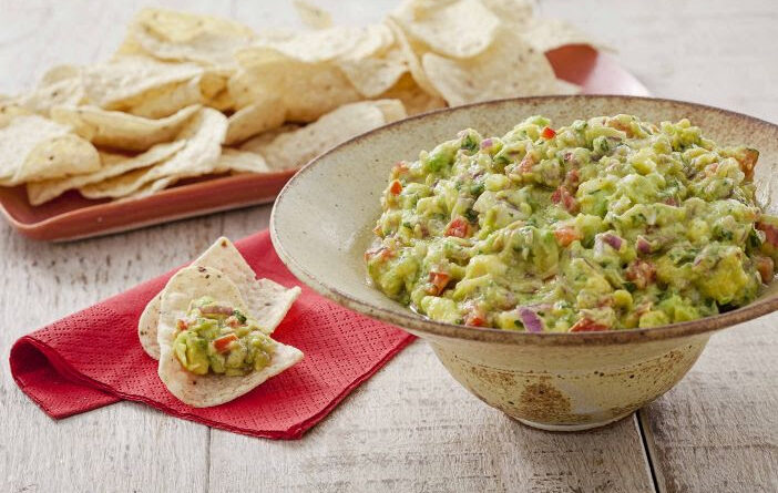 Em um recipiente, misture bem todos os ingredientes. Sirva com os nachos.