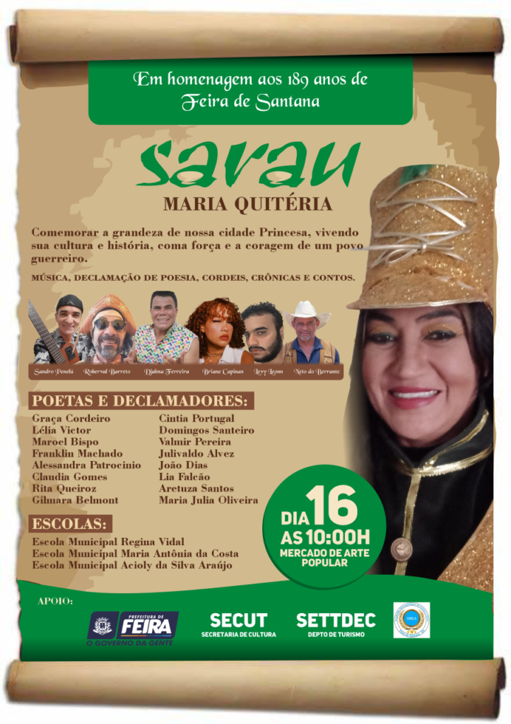 Em homenagem aos 189 anos de Feira de Santana, apresentamos o SARAU MARIA QUITÉRIA, com a artista feirense Maria Quitéria e Convidados. O evento acontecerá dia 16, às 10 horas, no Mercado de Artes Popular, aberto ao público e sem fins lucrativos.