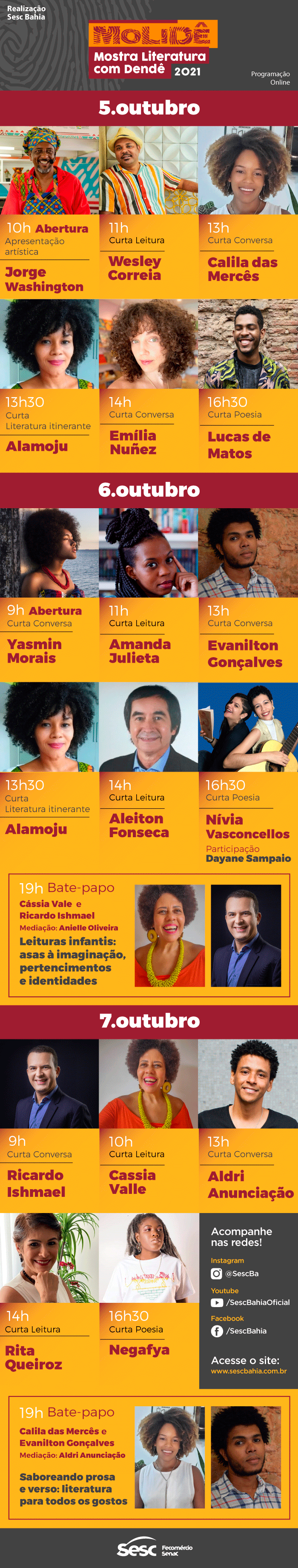 De 5 a 7 de outubro, o Sesc Bahia realiza a 1ª edição da Mostra Literatura com Dendê – MoLiDê, uma celebração às manifestações literárias cultivadas em terras baianas, aproximando o público dos escritores, artistas, editores locais e toda a rede que faz reverberar o valioso tesouro oral e escrito do estado. Serão 3 dias de Mostra em formato online, gratuito e acessível para todas e todos, fomentando a literatura, sem delimitar fronteiras. A programação acontece de forma simultânea no Instagram – @sescba | Facebook – facebook.com/sescbahia; e canal Sesc Bahia no Youtube – www.youtube.com/SescBahiaOficial.